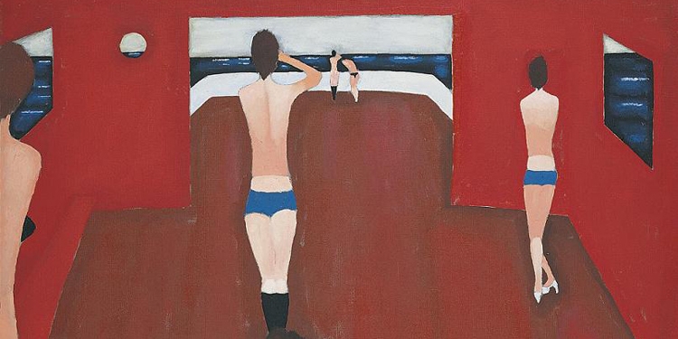 Największe zainteresowanie kolekcjonerów wzbudzą prace należące do najbardziej charakterystycznego dla Nowosielskiego cyklu przedstawień sportsmenek, gimnastyczek i pływaczek, często ukazywanych w zaskakujących perspektywach i pozach. Warto w tym kontekście wymienić dwa płótna: „Pierwszy śnieg” i „Dziewczyny na statku” (fragment na zdjęciu).
