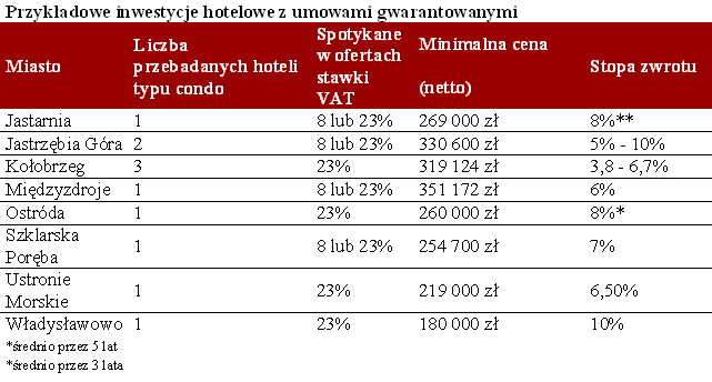 Szacując rentowność inwestycji w taką nieruchomość, czyli potencjalny roczny przychód z najmu względem wartości netto pokoju hotelowego, trzeba uwzględnić podatek VAT. Cena, jaką inwestor musi zapłacić za nieruchomość zawiera bowiem VAT, ale podatek ten można „odzyskać”.
