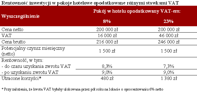 Gdyby inwestor stał przed wyborem identycznie atrakcyjnych ofert dwóch gotowych pokoi hotelowych, w przypadku których jeden byłby opodatkowany stawką 8%, a drugi stawką 23%, lepiej wybrać pierwszą z ofert.