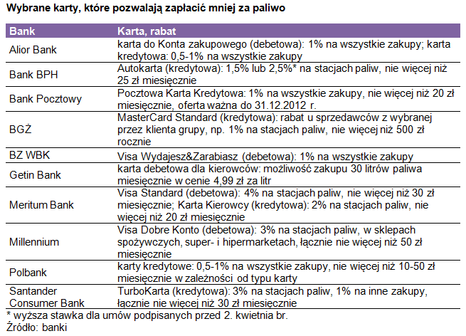 Na najwyższy procentowo rabat mogą liczyć klienci Getin Banku. Ta instytucja oferuje możliwość zmniejszenia ceny pierwszych 30 litrów paliwa zakupionych w każdym miesiącu do 4,99 zł za litr. Jednak zniżka jest naliczana od ogłaszanych przez bank cen zryczałtowanych, a nie od kwot, jakie kierowca faktycznie zostawi na stacjach paliw.