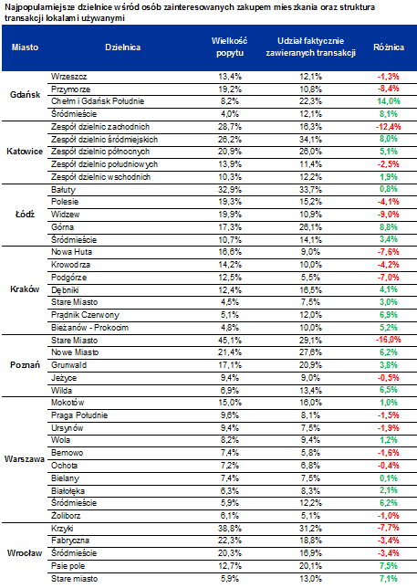 Odmienna sytuacja ma miejsce w dzielnicy Górnej i w przypadku Śródmieścia. Ta pierwsza, pomimo kilkunastoprocentowego zainteresowania wśród poszukujących mieszkań, przyciągnęła przeszło jedną na cztery transakcje.
