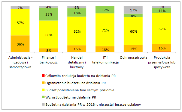 Największy odsetek planujących wzrosty wydatków został odnotowany w finansach i bankowości (28 proc.) oraz w handlu (18 proc.). Największy odsetek planujących redukcje budżetów PR występuje w administracji.
