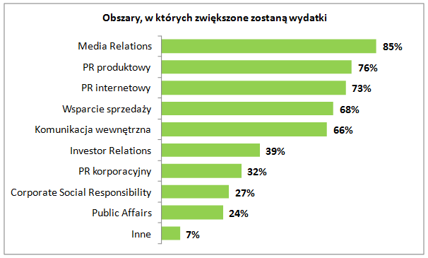 Na pytanie o obszary/narzędzia, na które firmy zamierzają zwiększyć swoje wydatki, pierwsza trójka odpowiedzi nie zaskakuje. Są to standardowe narzędzia typu: media relations, PR produktowy czy też działania w internecie.
