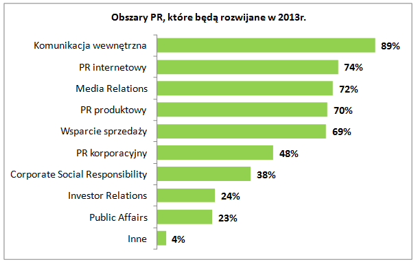 Dodatkowo badanym zadano pytanie o obszary/działania PR, które będą rozwijane w 2013 r. Oczywiście w domyśle chodzi o działania w ramach zwiększonego, obecnego lub nieznacznie zmniejszonego budżetu. Tutaj zdecydowanie dominuje komunikacja wewnętrzna, a następnie działania w internecie czy media relations.