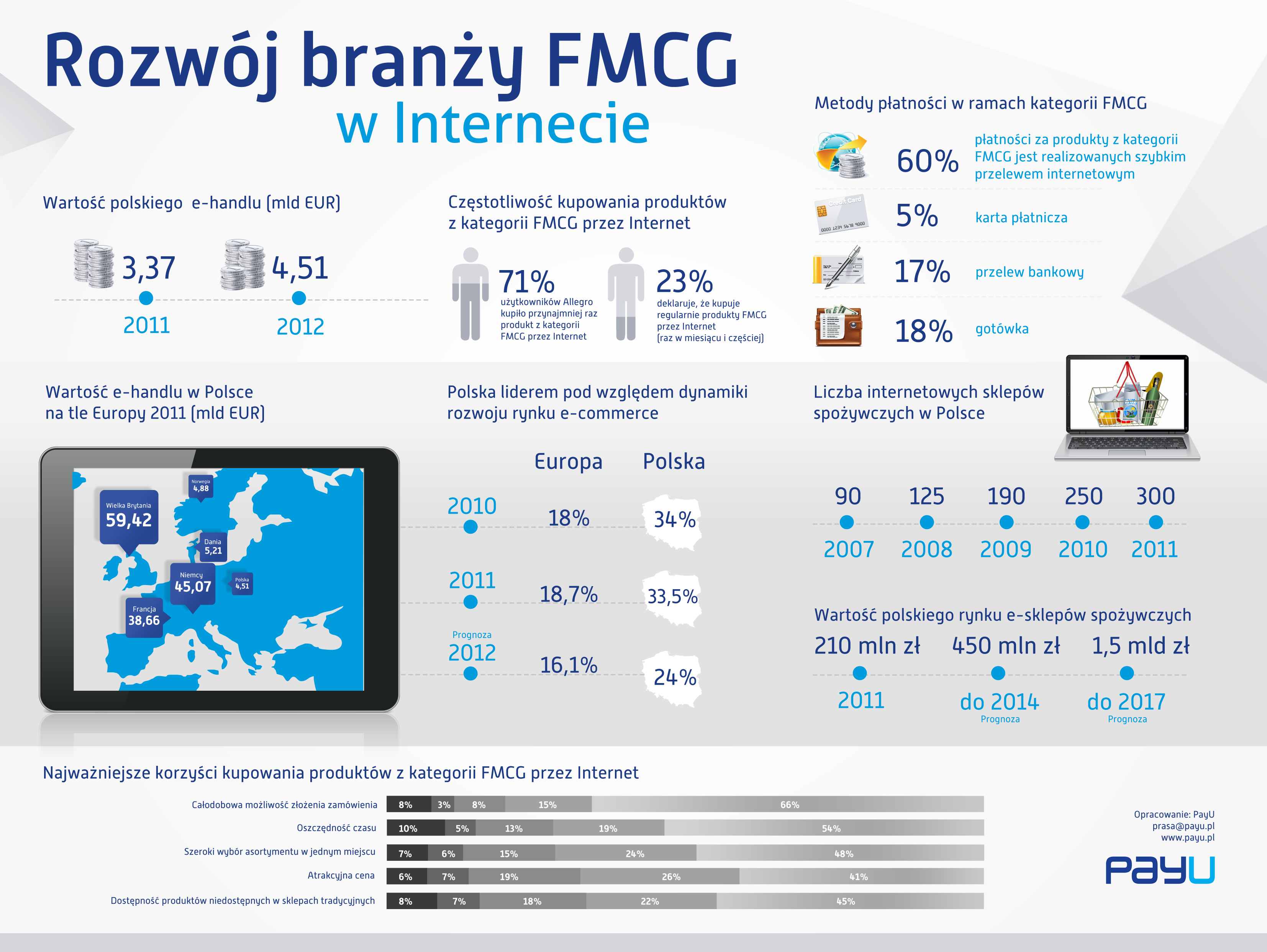 – Polska jest liderem pod względem dynamiki wzrostu rynku e-commerce na tle innych krajów europejskich. Internet to dla podmiotów FMCG dochodowy, dodatkowy kanał sprzedaży i coraz więcej z nich proponuje sprzedaż w sieci – mówi Joanna Kuzdak, dyrektor zarządzająca PayU SA. – Rozwój e-FMCG sygnalizuje rosnące zainteresowanie konsumentów zamianą tradycyjnego marketu na wirtualną półkę – dodaje.