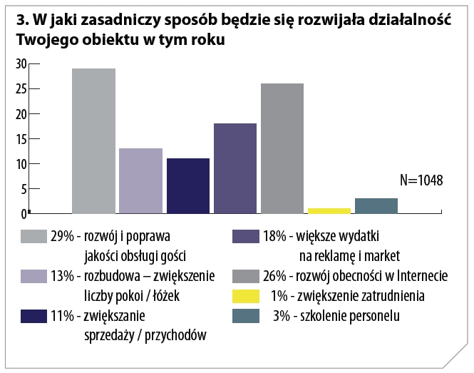 Pytanie o priorytetowe działania, jakie będą w roku 2012 prowadzili w swych obiektach hotelarze, przyniosło dwie niemal równorzędne odpowiedzi: 29 proc. za najważniejsze uznało „rozwój i poprawę jakości obsługi gości”, a 26 proc. „rozwój obecności w internecie”.