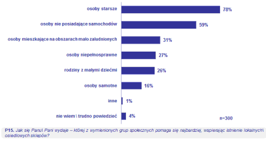 Pośród osób, które wzięły udział w badaniu, średnia ocena dla funkcji, jaką pełnią lokalne sklepy wyniosła 4,9 punktu. Zdaniem przedstawicieli samorządów, wspierając handel lokalny pomaga się w największym stopniu osobom starszym, niepełnosprawnym, rodzicom z małymi dziećmi oraz osobom, które nie posiadają samochodu.