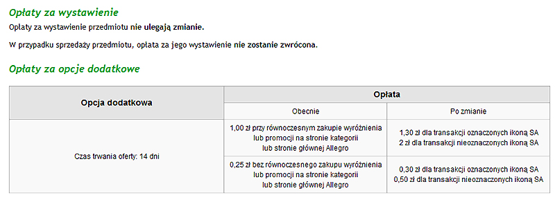 Zmienią się także opłaty za opcję dodatkową wystawiania ofert na 14 dni, przy czym wysokość opłaty zależeć będzie od tego czy transakcja została oznaczona ikoną Standardu Allegro.