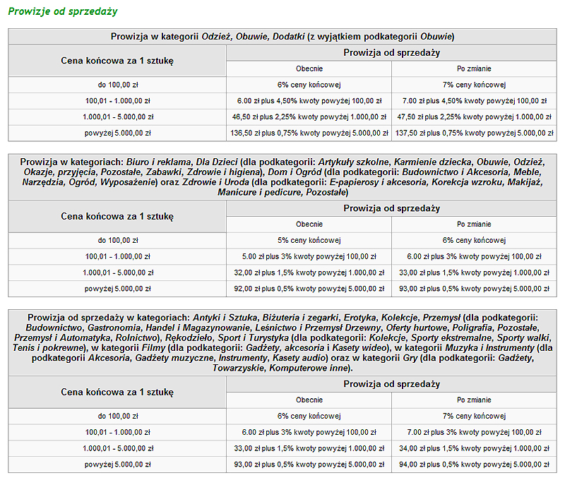 Zmienią się prowizje od sprzedaży. O 1 proc. wzrośnie opłata w pierwszym progu cenowym. Podwyżka dotyczyć będzie wybranych kategorii (zobacz w tabelach poniżej).