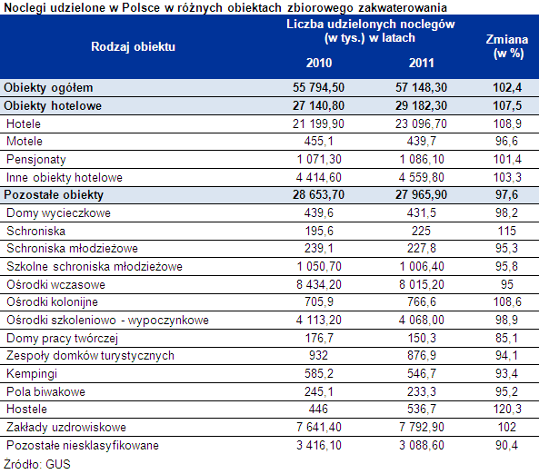 Wzrost zainteresowania o 7,5 proc. zanotowały natomiast obiekty hotelowe, które udzieliły w 2011 roku 29,2 mln noclegów. Jest to więc większa liczba niż w obiektach niehotelowych, ale jest to zasługa turystów zagranicznych.
