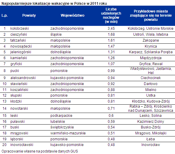 Nie wszystkie lokalizacje cieszą się jednak identyczną popularnością. Home Broker na podstawie danych GUS przygotował ranking najpopularniejszych wśród turystów powiatów. Zgodnie z nim wśród lokalizacji wakacyjnych największym wzięciem cieszyły się powiaty kołobrzeski (z Kołobrzegiem i Ustroniem Morskim), cieszyński (z Ustroniem, Wisłą i Istebną) i tatrzański (Zakopane).