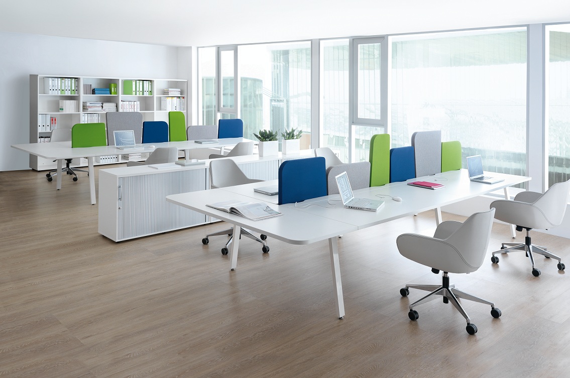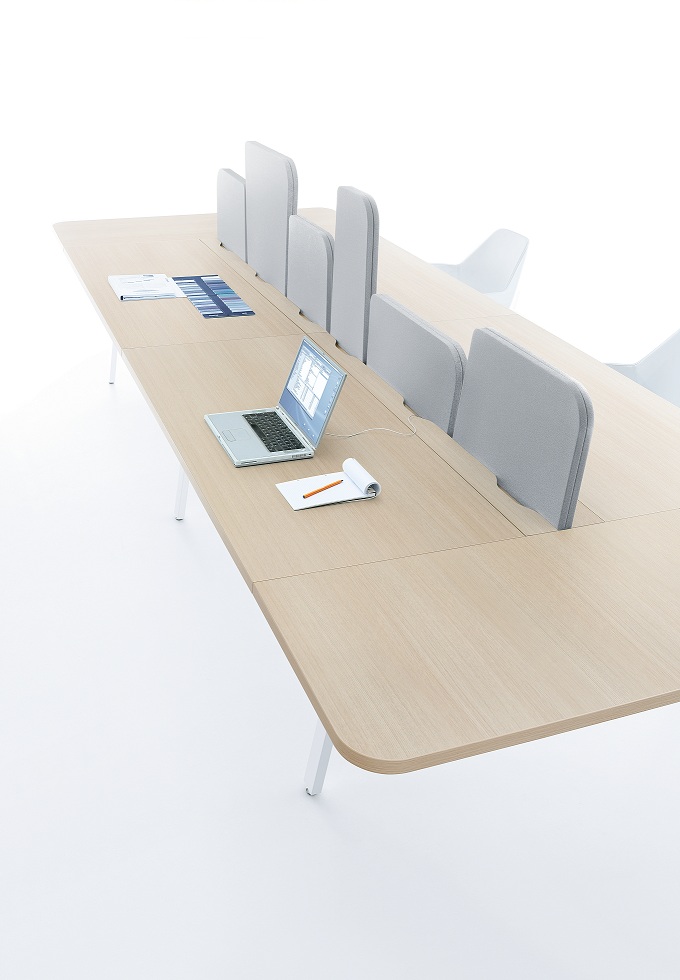 Dodatkowo zaokrąglone, kolorowe, miękkie bryły, które stanowią modyfikowalną formę ekranów biurek, działają akustycznie oraz sprawiają, że platforma nie jest monotonna i stanowisko pracy można dowolnie dostosować do specyfiki otoczenia i potrzeb użytkownika.