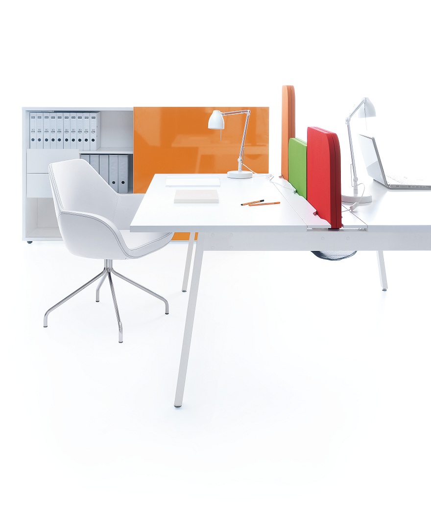 Dodatkowo zaokrąglone, kolorowe, miękkie bryły, które stanowią modyfikowalną formę ekranów biurek, działają akustycznie oraz sprawiają, że platforma nie jest monotonna i stanowisko pracy można dowolnie dostosować do specyfiki otoczenia i potrzeb użytkownika.